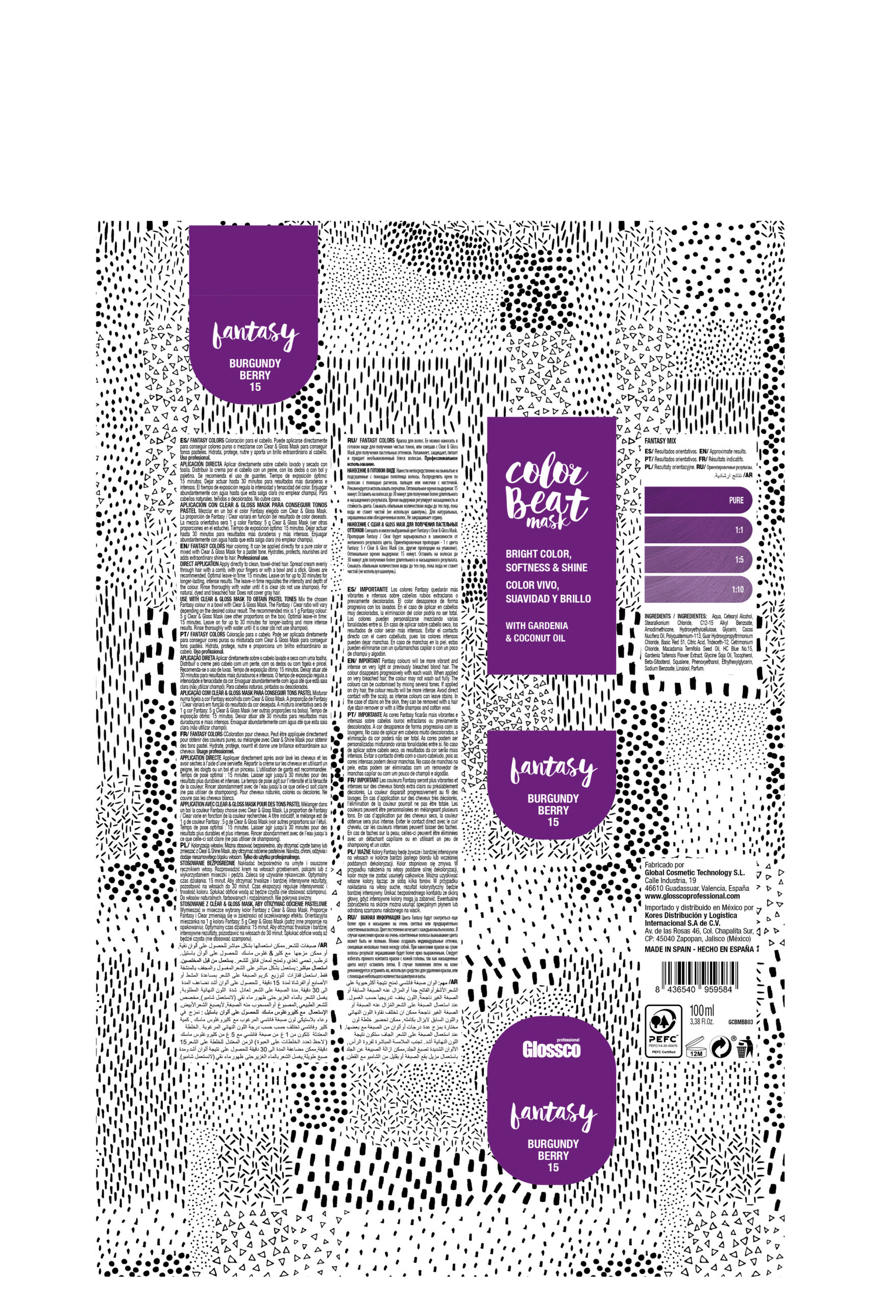 Mezclar en un bol el color Fantasy elegido con Clear & Gloss Mask. La proporción de Fantasy/Clear variará en función del resultado de color deseado. La mezcla orientativa será 1 g color Fantasy: 5 g Clear & Gloss Mask (ver otras proporciones en la tabla). Tiempo de exposición óptimo: 15 minutos. Dejar actuar hasta 30 minutos para resultados más duraderos y más intensos. Enjuagar abundantemente con agua hasta que esta salga clara (no emplear champú).