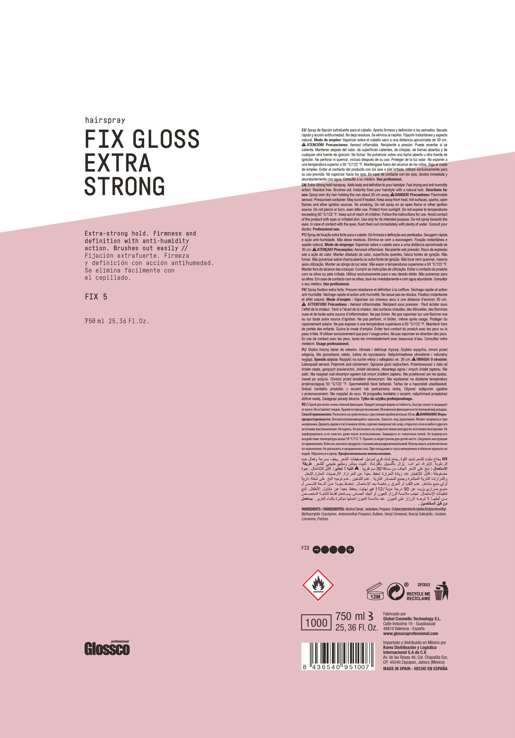 Fix gloss extra strong es un spray de fijación extrafuerte de Glossco Professional.