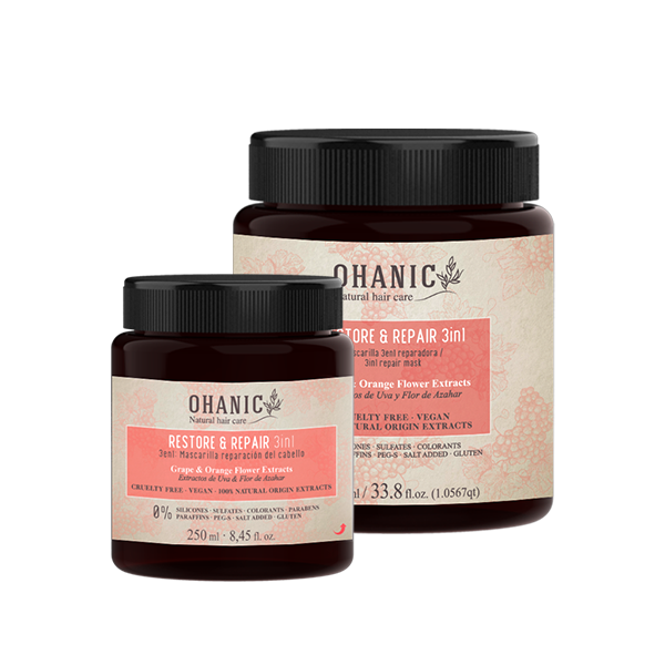 La mascarilla Restore & Repair de Ohanic contiene extractos de uva y flor de azahar. Sus fórmulas sin sulfatos basadas en extractos vegetales, reparan y protegen el cabello dañado, multiplican su acción si se usan combinadas. Su fórmula alcanza un indice de naturalidad del 97,38%.